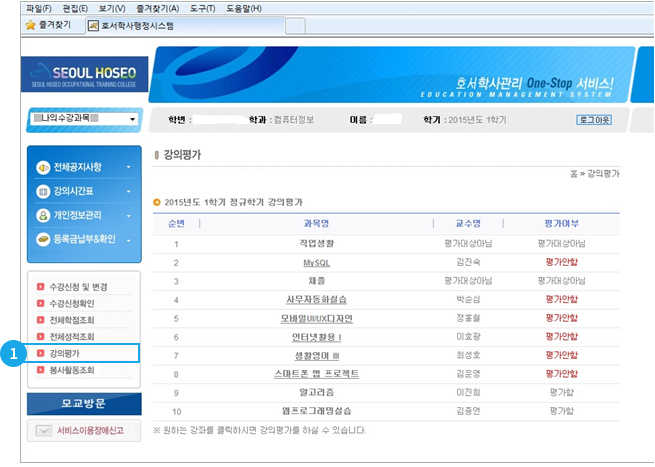 호서교육정보시스템에 로그인 후 왼쪽메뉴 하단의 강의평가를 선택